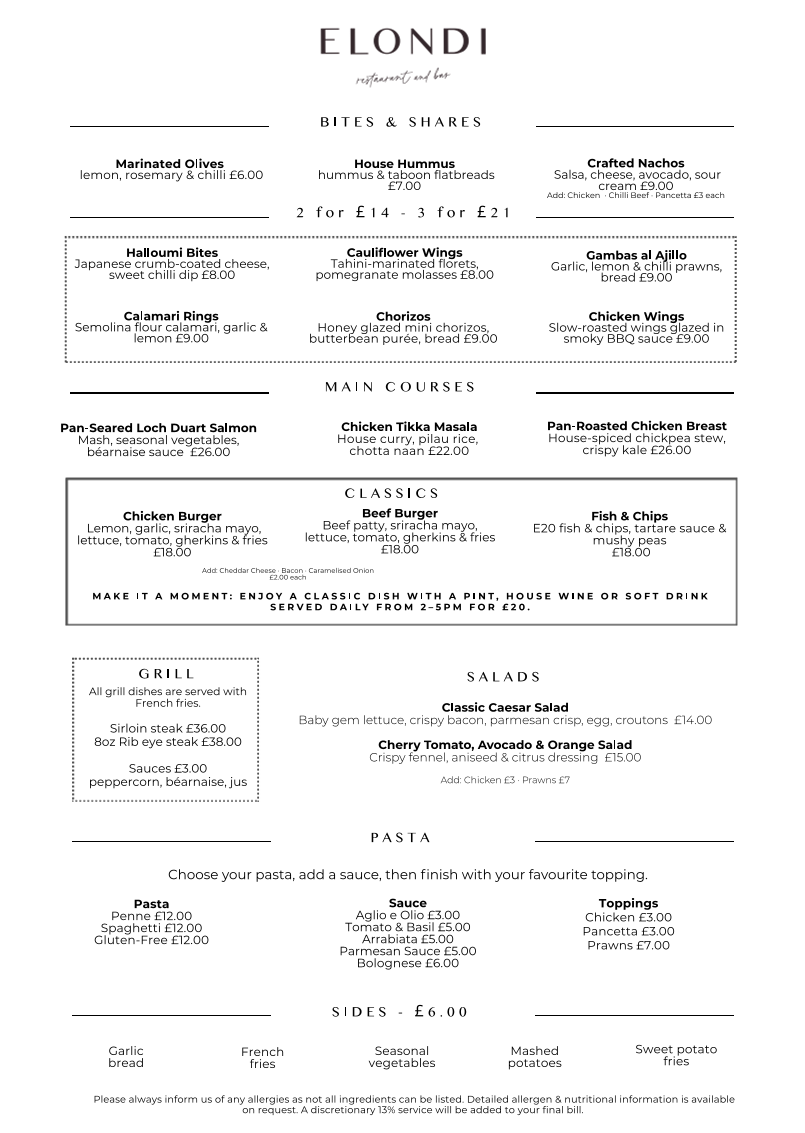 The Elondi Restaurant, Bar And Terrace Menu is where the venue truly shines. Whether you're in the mood for hearty meals, lighter bites, or refreshing drinks, the menu has something for everyone. The food is prepared with attention to detail, using fresh, high-quality ingredients. Some standout dishes include their expertly cooked steaks, vibrant salads, and creative small plates that offer unique flavor combinations. The drink selection is equally impressive, offering a range of cocktails, wines, and craft beers that perfectly complement the meal options.